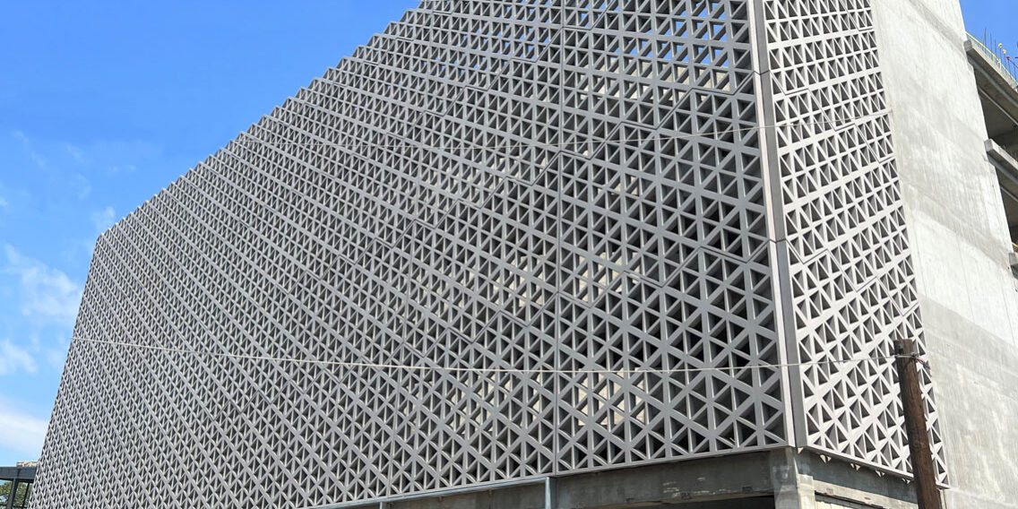 With help from the precast concrete manufacturer, GATE Precast, the architect was able to achieve a similar appearance to the original ‘breeze block’ concept using architectural precast panels. The cladding emulates the look of mesh and allows both natural light and air to freely flow through the parking structure, while still providing the strength and durability of concrete. Additionally, by selecting precast concrete, the design team reduced the complexity of construction and saved time compared to the breeze block option. Installation of this highly decorative facade was complete in just 12 days.